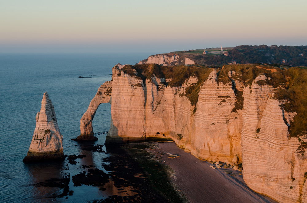 | Bildbeschreibung: | Felsnadel Aguille und die Porte d'Aval am Abend |